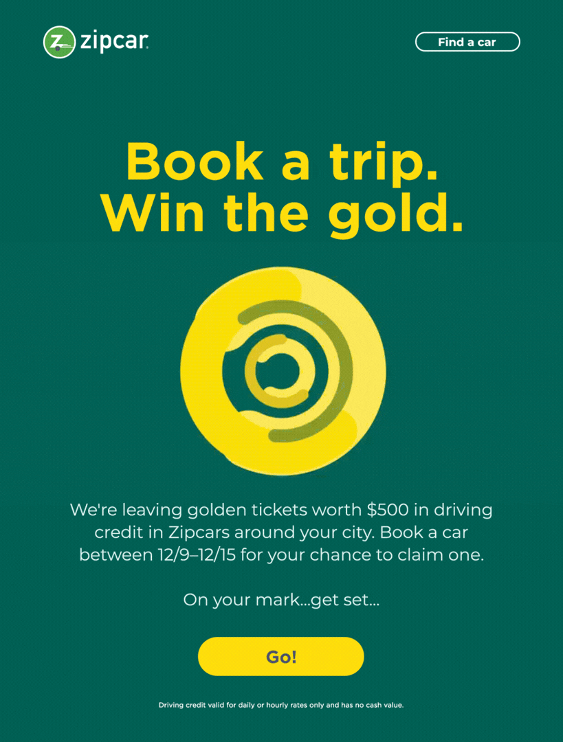 To boost reservations in top markets, we created a Golden Ticket-style surprise and delight where members could find $500 in driving credit upon unlocking their Zipcar. The physical tickets shined with gold foil accents, inspiring all the accompanying graphics and allowing for a unique “prop” for all social content.
